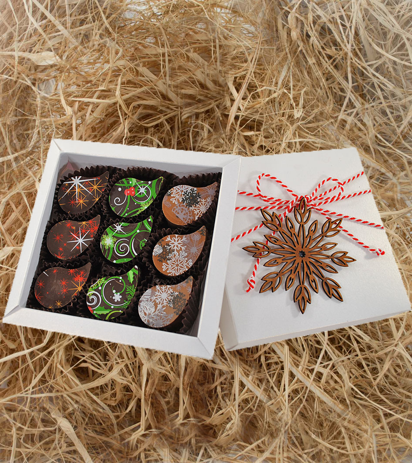 Delikatne, ręcznie wyrabiane pralinki czekoladowe z nadzieniem o smaku Wiśnie W Rumie, Piernikowym, oraz żubrówki. 9 sztuk pralinek zapakowane w srebrny prezencik z dekoracją.